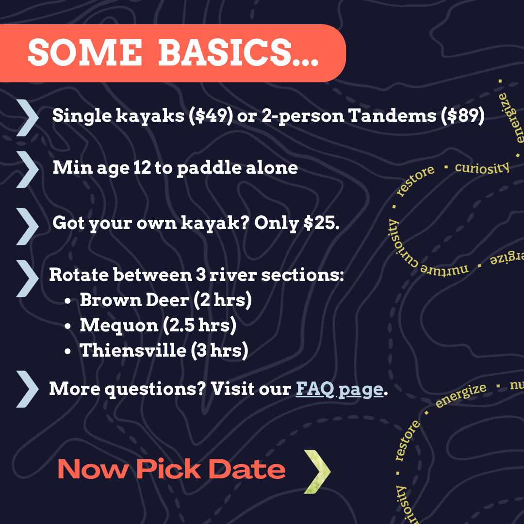 Our rotating schedule means we run one section per day from spring through fall, offering our three core sections in Brown Deer, Mequon and Thiensville most frequently. We will occasionally run other sections of the river due to event availability at launches or just to give you more options to see new scenery! Our high-quality rental is a sit-on-top kayak, with options for tandems or sit-insides if available.